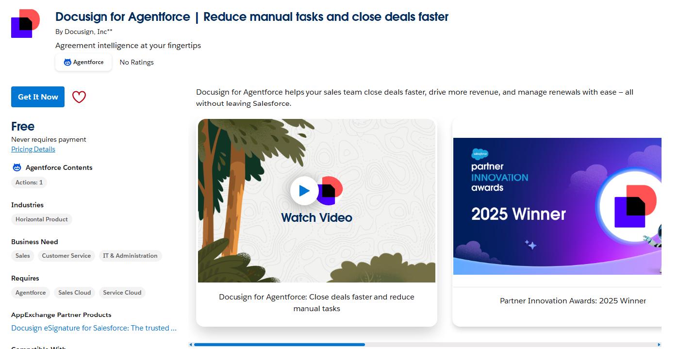 Initial Reaction: The functionality sounds great, but “Agentforce” feels like an add-on word here. The listing reads more like a standard Docusign integration page than an Agentforce-specific tool. There’s no obvious evidence of autonomous agent capabilities in play—yet.