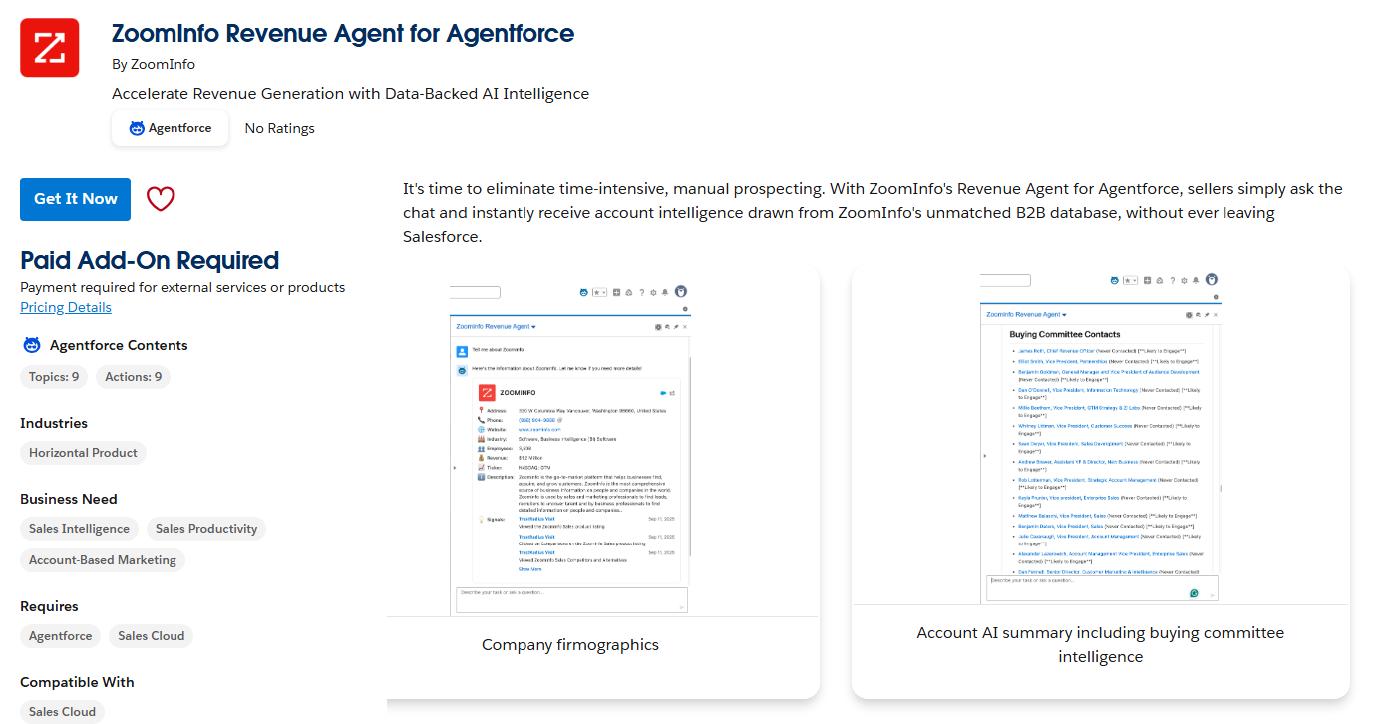 Initial Reaction: This one at least feels more like a real Agentforce integration—AI-driven, data-focused, and action-oriented. But with no reviews and no demos, it’s hard to tell how “autonomous” it actually is. Still, ZoomInfo’s data engine plus Salesforce agents could make for a strong combo.